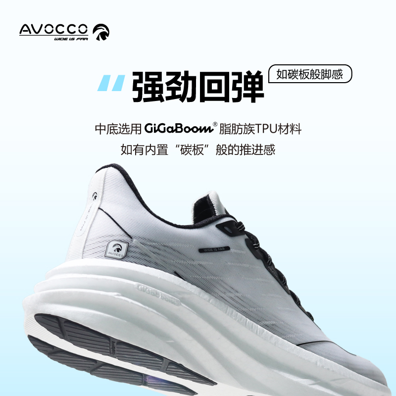 Avocco獨有的"寬鞋頭"設計,提供寬鬆的鞋頭空間,確保沒有磨腳的困擾,帶來零磨合和流暢的跑步體驗。
